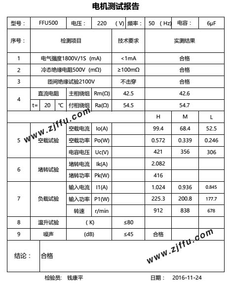 當(dāng)前位置:首頁 >> 新聞咨詢 >> FFU500電機(jī)測試報告FFU500電機(jī)測試報告 型號:FFU500 電壓:220 (V) 頻率:50 (Hz) 電容:6mF 1、檢測項目:電氣強(qiáng)度1800V/1S (mA);技術(shù)要求:<1mA;實測結(jié)果:合格。 2、檢測項目:冷態(tài)絕緣電阻500V (mQ);技術(shù)要求:>100mQ;實測結(jié)果:合格。 3、檢測項目:匝間絕緣試驗2100V;技術(shù)要求:不擊穿;實測結(jié)果:合 …