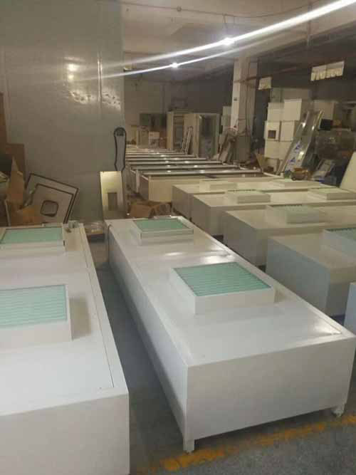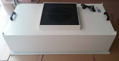 FFU層流罩設(shè)有初效過(guò)濾器、高效過(guò)濾器兩級(jí)過(guò)濾網(wǎng)。風(fēng)機(jī)從FFU頂部將空氣吸入并經(jīng)初、高效過(guò)濾器過(guò)濾,過(guò)濾后的潔凈空氣在整個(gè)出風(fēng)面以0.45M/S±20%的風(fēng)速勻速送出。