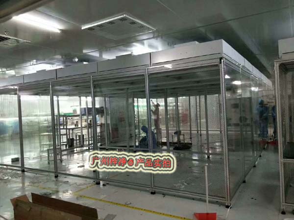 潔凈棚具體在高潔凈微環(huán)境的送風口處,由風機1、高效過濾單元2、緊固件3、鋁型材4、支撐墊片5和支架組成;支架組接成潔凈微環(huán)境空間的頂部,頂部材料一般為不銹鋼板、冷軋鋼板噴塑或防靜電亞克力板;