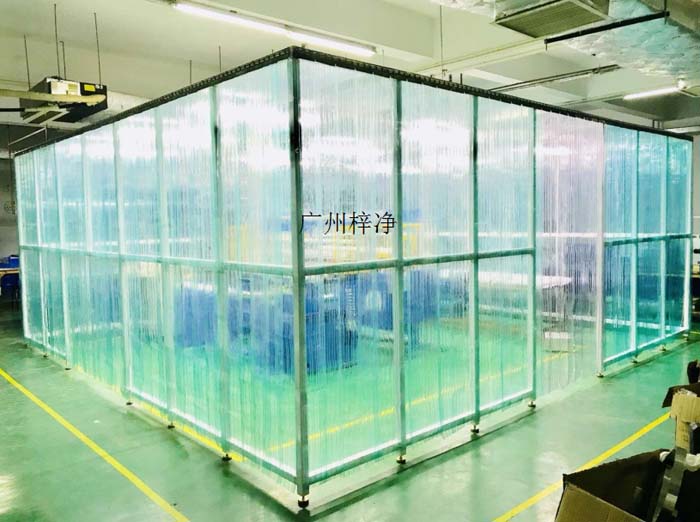 潔凈棚采用工業(yè)鋁材(或不銹鋼方通、鐵方通噴塑)作為框架,風(fēng)機(jī)濾網(wǎng)機(jī)組(FFU)送風(fēng),四周懸掛防靜電垂簾(或鋼化玻璃),其內(nèi)部凈化級別可達(dá)到100-10000級。適用于操作區(qū)內(nèi)局部凈化級別要求高的區(qū)域。
