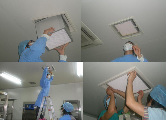 4.高效過(guò)濾器安裝前,必須對(duì)潔凈室進(jìn)行全面清掃、擦凈,凈化空調(diào)系統(tǒng)內(nèi)部如有積塵,應(yīng)再次清掃、擦凈,達(dá)到清潔要求。如在技術(shù)夾層或吊頂內(nèi)安裝高效過(guò)濾器,則技術(shù)層或吊頂內(nèi)也應(yīng)進(jìn)行全面清掃、擦凈。